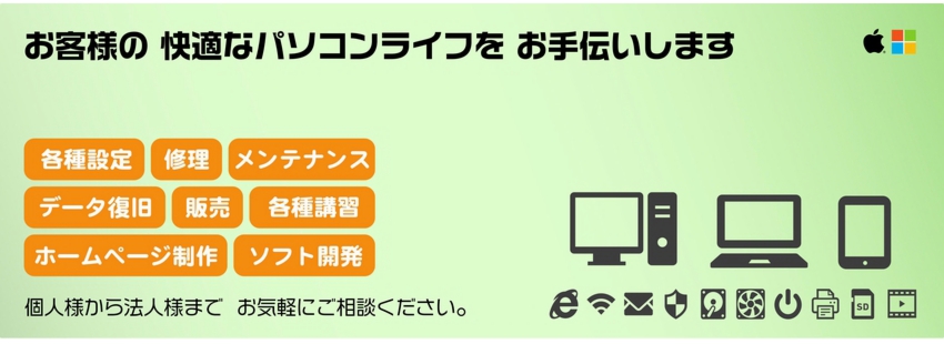 お困りではありませんか? パソコンの事なら何でもご相談下さい。 ○購入したけど操作できない ○初期設定ができない ○インターネットに接続できない ○無線LAN(Wi-Fi、ワイヤレス)接続ができない ○パソコンが壊れた? ○ウイルスに感染した? ○リカバリできない ○パソコンが起動しない ○エラーメッセージが出る ○ソフト・周辺機器のセットアップができない ○印刷できない ○DVDが書き込めない ○データを復旧したい ○デジカメのデータが消えた? ○データを移したい ○アップグレードをしたい